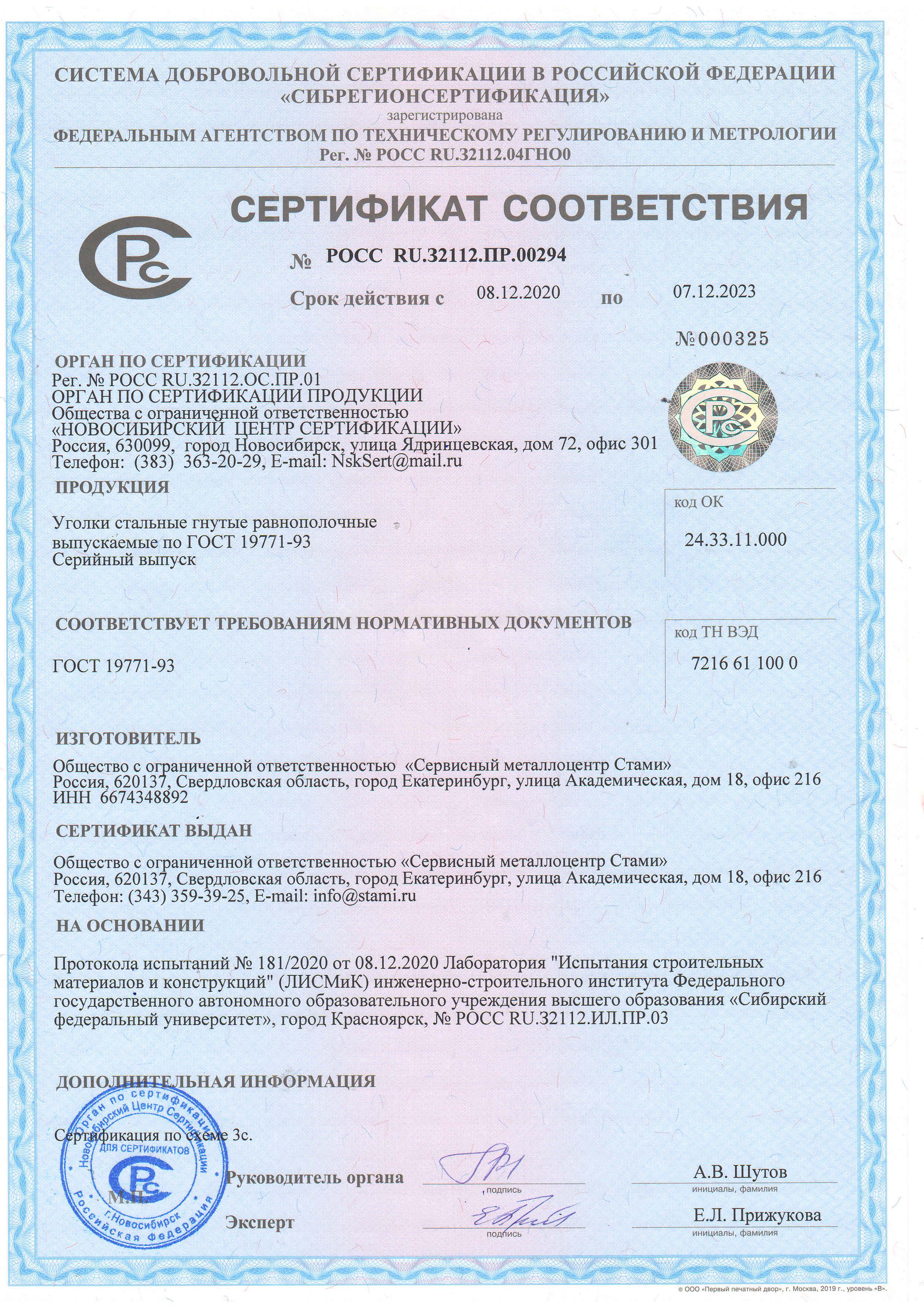 - Уголок гнутый производится строго по ГОСТ 19771-93, ГОСТ 19772-93, что подтверждается сертификатом соответствия.